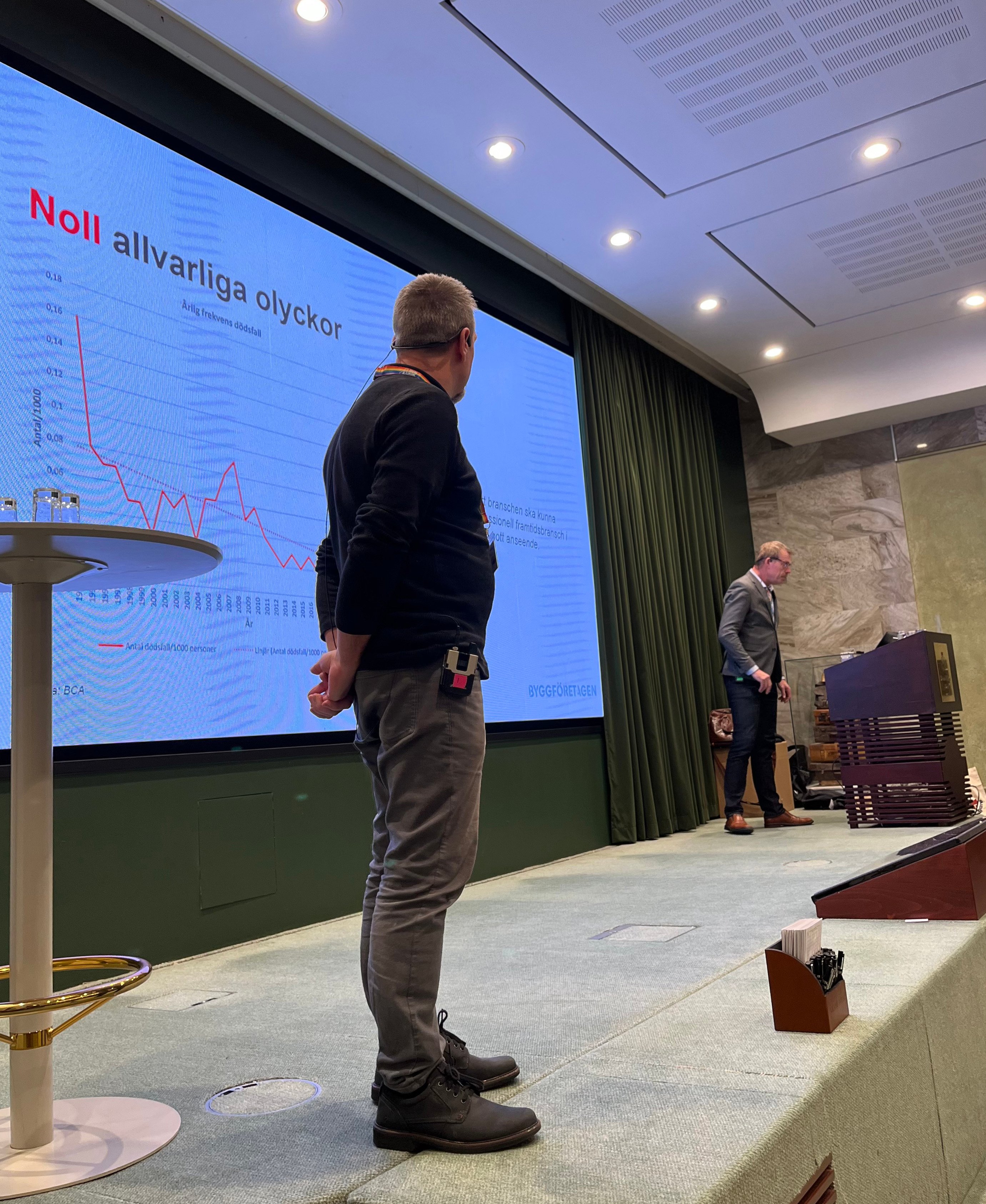 Efter en liten fikapaus var det dags för Robert Nilsson, arbetsmiljöansvarig på Byggnads Skåne, och Magnus Olsson, arbetsmiljöstrateg på Byggföretagen, att inta scenen. De inledde på traditionellt sätt med att prata om hur arbetsmiljön ser ut i byggbranschen. Viktig information som lärarna behöver kunna föra vidare till sina elever. Sen kom tvisten när man tog hjälp av appen Menti för att interagera med publiken. Genom att skicka ut frågor och påståenden i appen fick de omedelbara svar från publiken som man sen kunde diskutera kring. De ställde exempelvis en fråga om lärarna hade koll på lagar och regler inom arbetsmiljöområdet. Direkt kunde de se att majoriteten hade hyfsad koll och kunde då lägga sin fortsatta information på rätt nivå. Andra frågor skulle värderas och andra tillät fri text. Frågan om vad man som lärare oroar sig mest över när man skickar ut elever på APL visade på saker som Närvaro, Skaderisk, Bemötande. Återigen kunde Robert och Magnus direkt bemöta svaren och diskutera hur man kan hantera oron. Upplägget med appen och svar i realtid verkade uppskattas av publiken och gav många bra diskussioner.